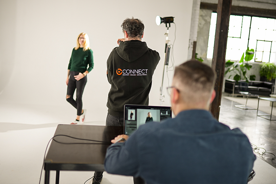 Eine Frau posiert vor weißem Hintergrund in einem Fotostudio. Ein Fotograf im 'b.CONNECT'-Hoodie fotografiert sie, während eine dritte Person am Laptop die Aufnahmen direkt betrachtet. Studioleuchten und moderne Loft-Umgebung im Hintergrund.