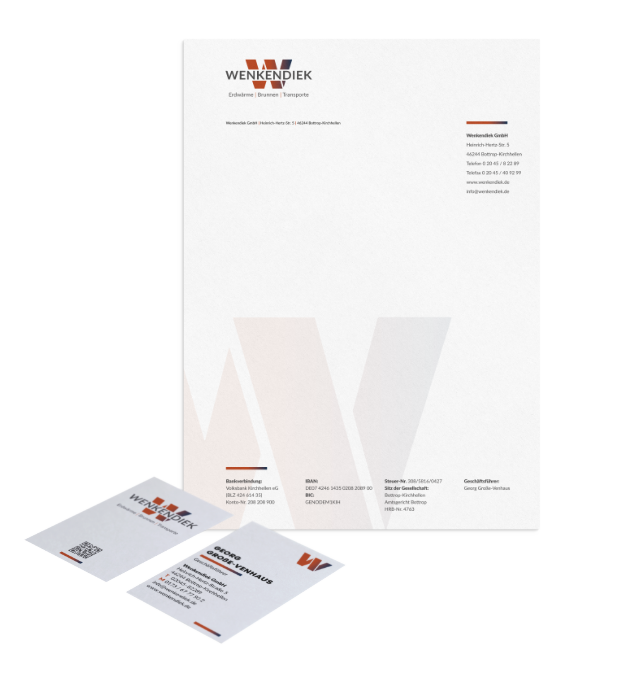 Von Visitenkarten über Fahrzeugbeschriftungen bis hin zu Broschüren. Wir gestalteten eine einheitliche Geschäftsausstattung, die den neuen Look von Wenkendiek konsequent in allen Bereichen sichtbar macht.