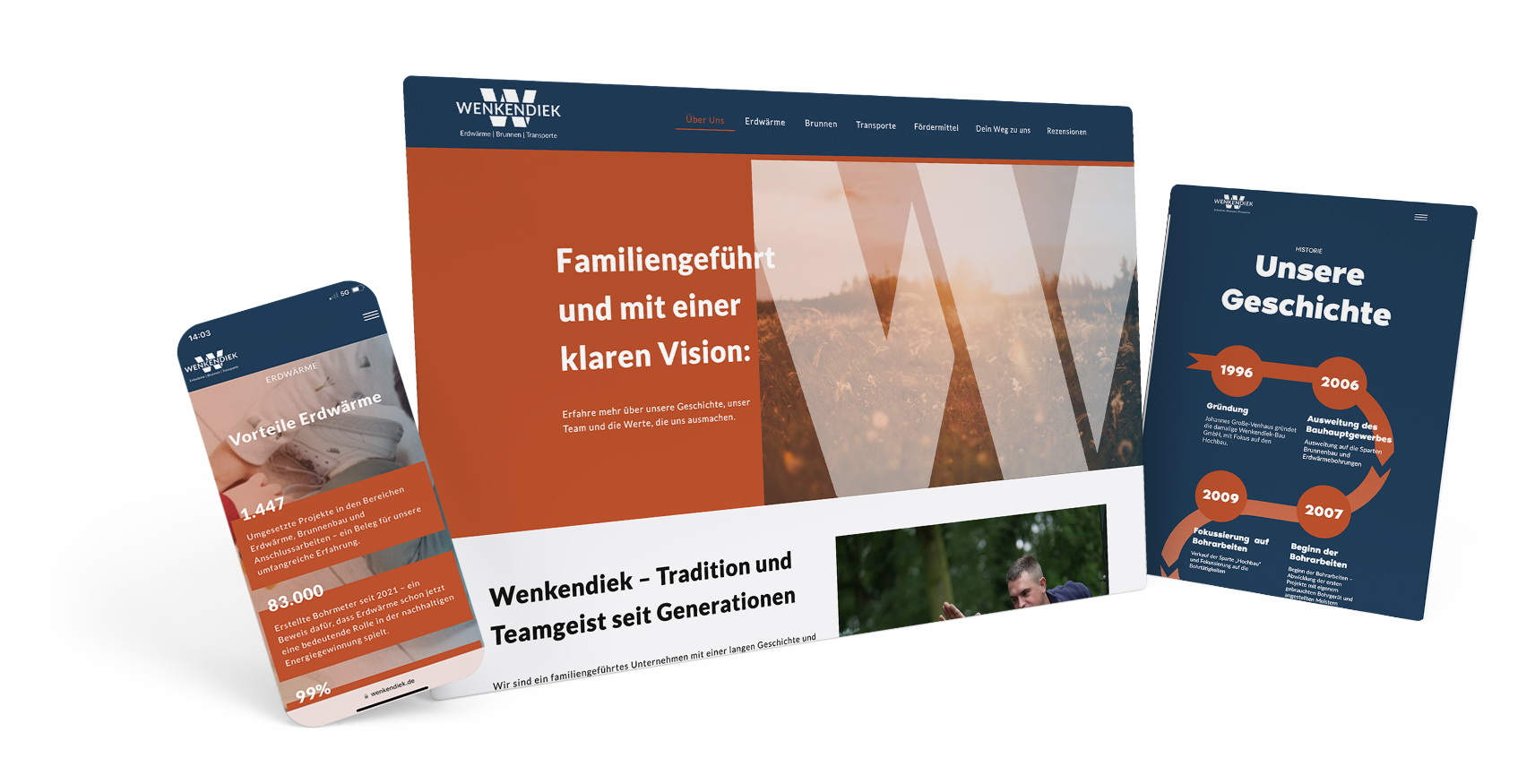 Unsere Aufgabe ist es, Wenkendiek als modernen, kompetenten und nahbaren Ansprechpartner zu positionieren und dieses sowohl online als auch offline. Dabei werden komplexe Themen wie Geothermie und Brunnenbau verständlich und attraktiv kommuniziert. Wenkendiek ist ein regionales Familienunternehmen, dieser Punkt sollte in der Kommunikation eine wichtige Rolle spielen.